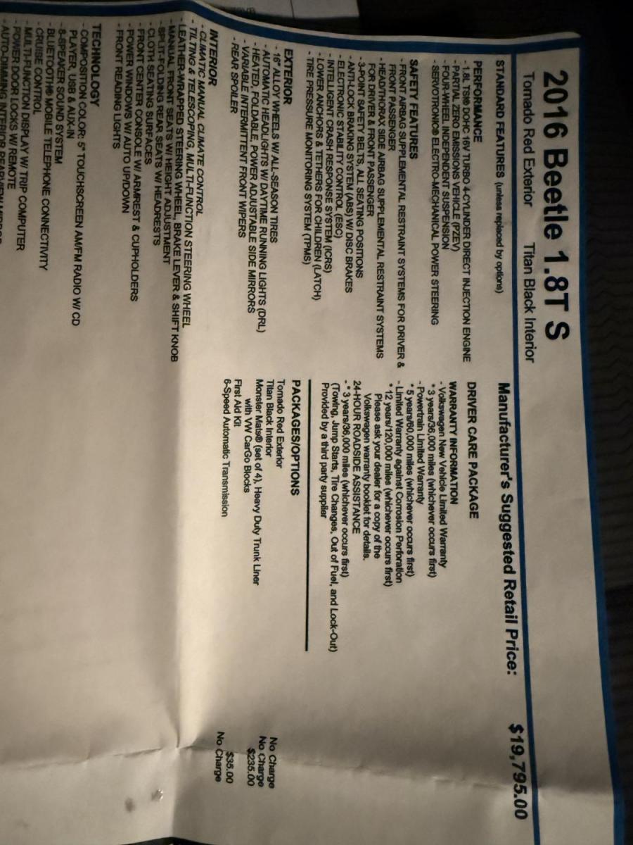 Make every drive memorable in this 2016 Volkswagen Beetle 1.8T S! Under the hood, a lively 1.8L turbocharged engine pairs with a smooth 6-speed automatic transmission to deliver peppy performance and outstanding efficiency—up to 33 MPG highway. Enjoy peace of mind with daytime running lights and dusk-sensing headlights for added safety and visibility. Inside, the 5.0" touchscreen and 8-speaker audio system with auxiliary and USB inputs let you connect your favorite music with ease, while the auto-dimming rearview mirror adds comfort and convenience. With its legendary design, modern technology, and efficient turbocharged power, this Beetle is ready to brighten your daily commute and weekend adventures. It also comes with a 3 month/3,000 mile warranty for peace of mind. Call or text us today to schedule your test drive! Don’t miss your chance to own this fun, feature-packed 2016 Volkswagen Beetle 1.8T S—make it yours today!